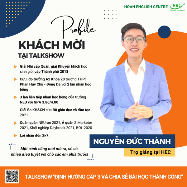 Trong “TALKSHOW: ĐỊNH HƯỚNG CẤP 3 VÀ CHIA SẺ BÀI HỌC THÀNH CÔNG” lần này, Hoan English xin vinh dự được chào đón những vị khách mời đầy tài năng và kinh nghiệm.