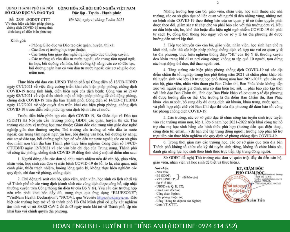 Ngày 13/7, SGD&ĐT Hà Nội có công văn gửi các phòng giáo dục và đào tạo, trung tâm giáo dục nghề nghiệp - giáo dục thường xuyên; trường có vốn đầu tư nước ngoài; trung tâm ngoại ngữ, tin học, bồi dưỡng văn hóa, bồi dưỡng kỹ năng; cơ sở đào tạo, bồi dưỡng ngắn hạn có vốn đầu tư nước ngoài; cơ sở giáo dục mầm non, yêu cầu tăng cường các biện pháp phòng, chống trong tình hình dịch COVID-19 diễn biến phức tạp. (nguồn: báo danviet.vn)