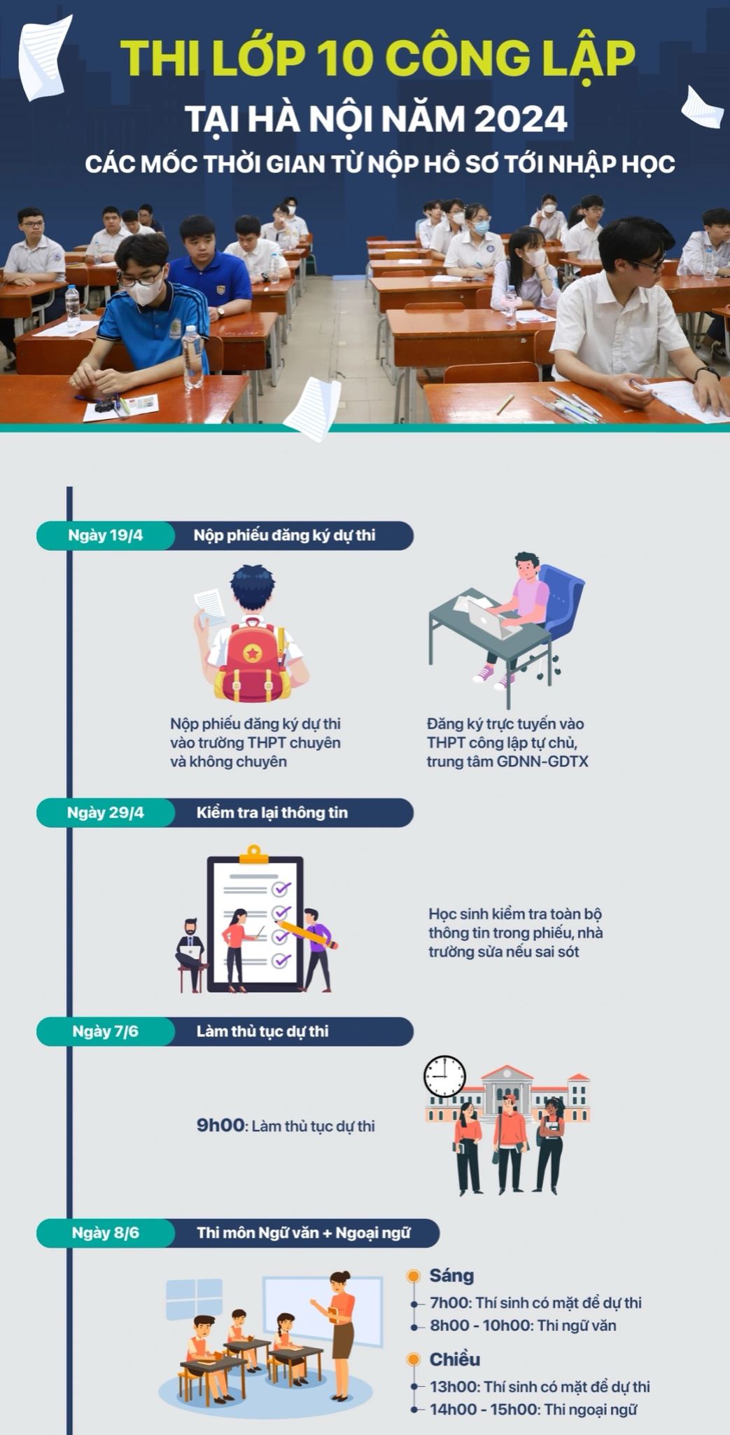 Kỳ thi lớp 10 công lập tại Hà Nội năm 2024 sẽ diễn ra ngày 8-9/6 dành cho tất cả thí sinh. Học sinh cần ghi nhớ các mốc thời gian quan trọng từ khi đăng ký nguyện vọng đến lúc nhập học chính thức.