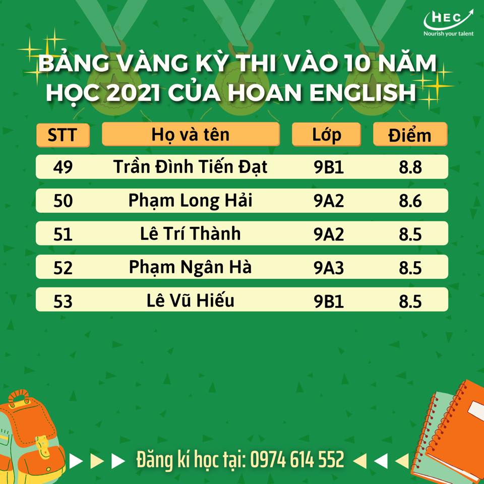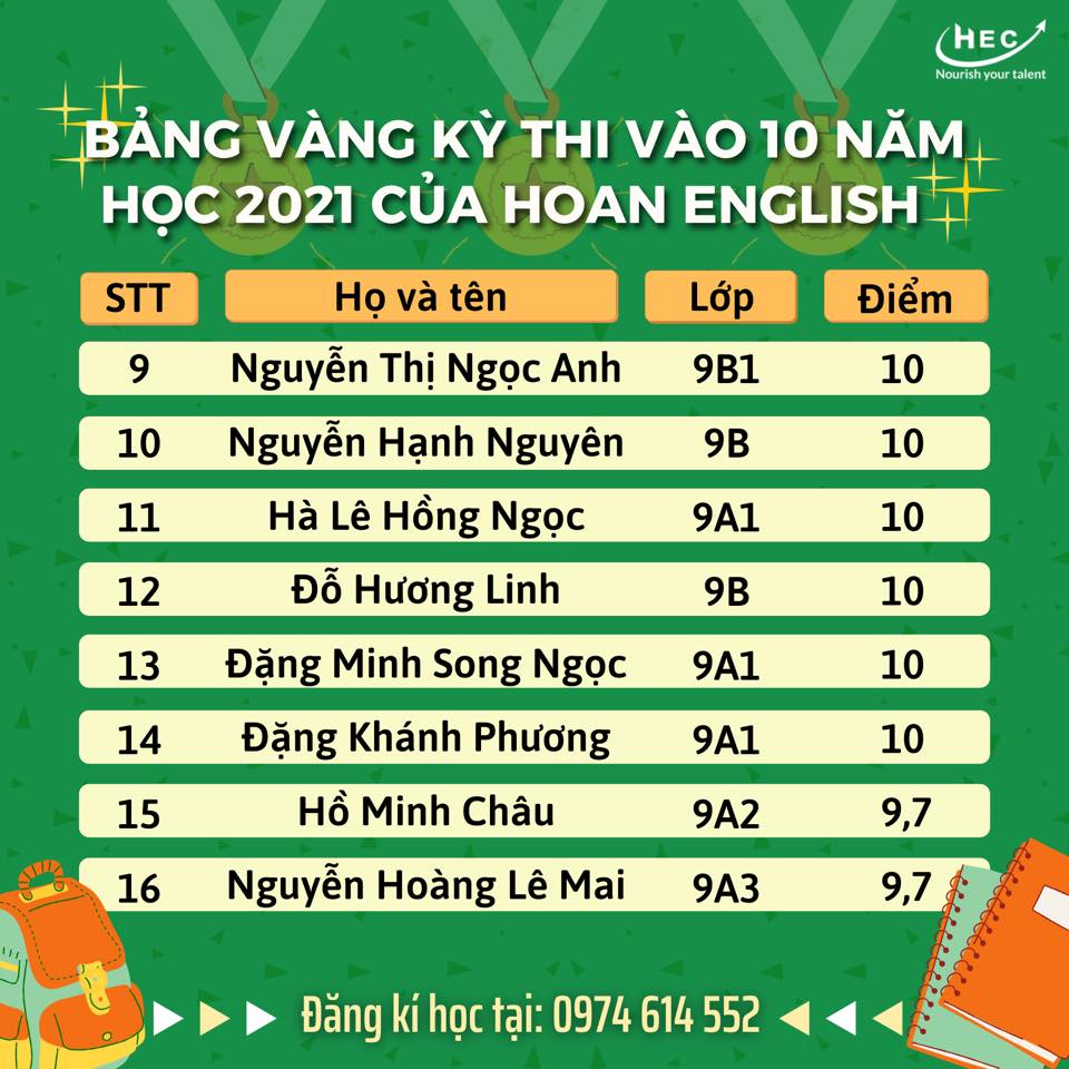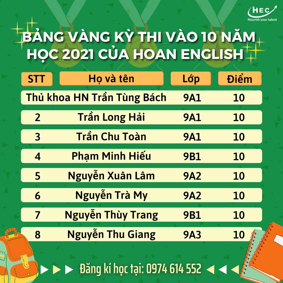Bảng vàng của Hoan English năm nay có tổng cộng 14 điểm 10 trọn vẹn và 53 điểm 8.5 trở lên. Những sĩ tử nào sẽ được vinh danh trong năm học này? Cả nhà cùng xem BẢNG VÀNG THÀNH TÍCH THI VÀO 10 NĂM 2021 CỦA HỌC SINH TẠI HOAN ENGLISH ngay tại đây nhé!