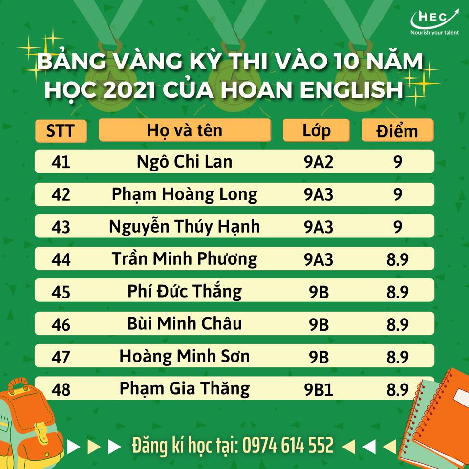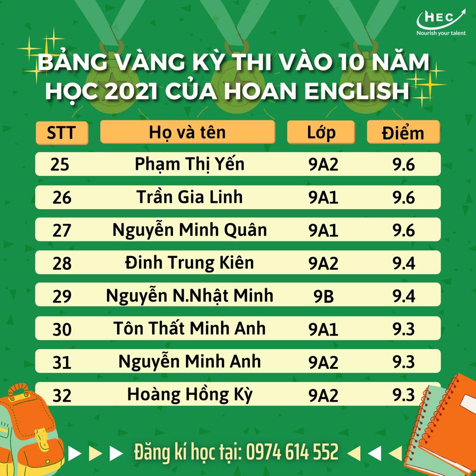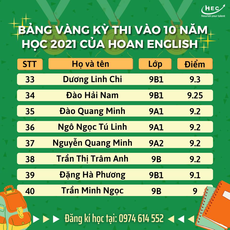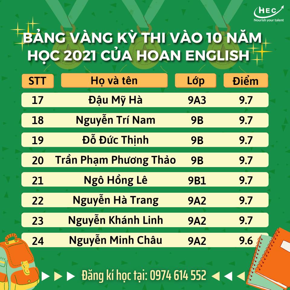 Bảng vàng của Hoan English năm nay có tổng cộng 14 điểm 10 trọn vẹn và 53 điểm 8.5 trở lên. Những sĩ tử nào sẽ được vinh danh trong năm học này? Cả nhà cùng xem BẢNG VÀNG THÀNH TÍCH THI VÀO 10 NĂM 2021 CỦA HỌC SINH TẠI HOAN ENGLISH ngay tại đây nhé!