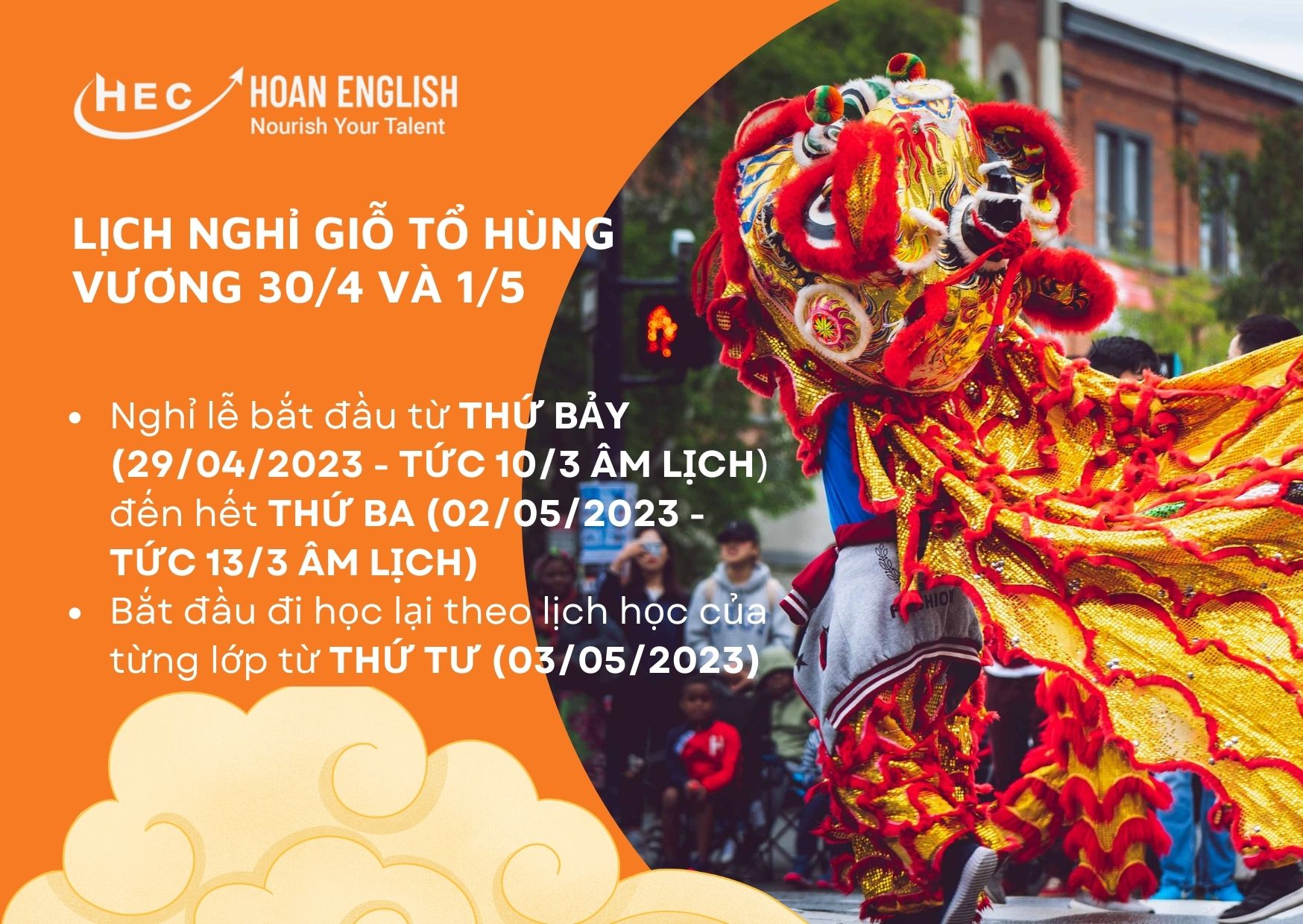 HS các lớp sẽ nghỉ lễ bắt đầu từ THỨ BẢY (29/04/2023 - TỨC 10/3 ÂM LỊCH) đến hết THỨ BA (02/05/2023 - TỨC 13/3 ÂM LỊCH).