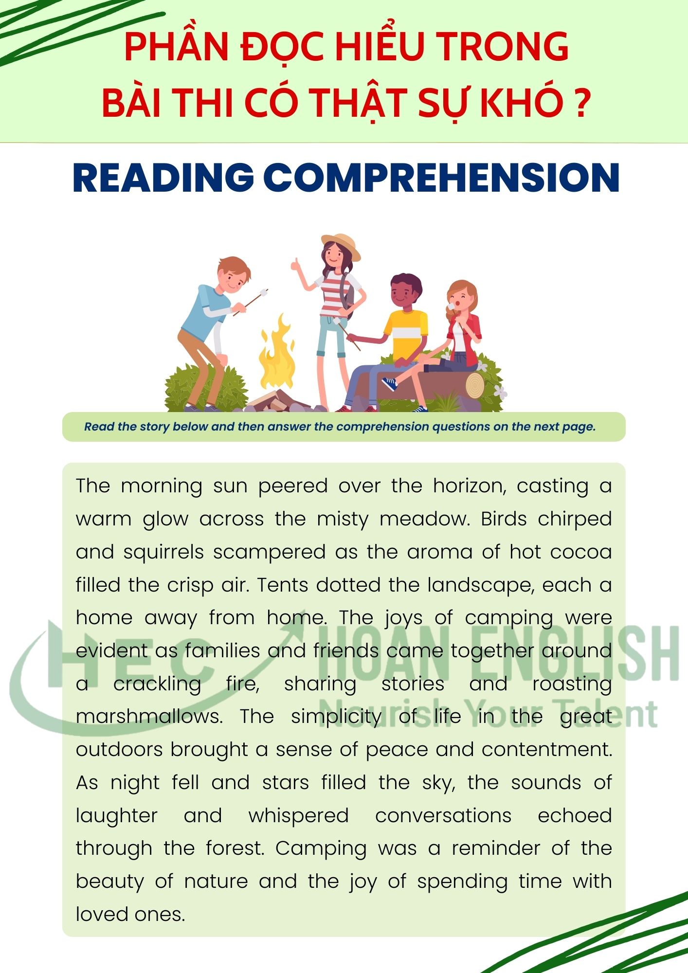 Hoan English mang đến cho các bạn cách tiếp cận và phân tích văn bản theo phong cách khoa học nhất: sâu sắc, tinh tế và hiệu quả. HEC sẽ giúp các em mở rộng tầm nhìn và sâu sắc trong từng bài đọc.